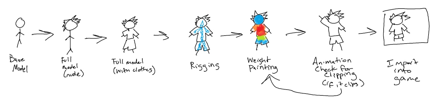 Okay, with that said, what's the new game stuff? Well, I've decided to make another major change. This whole time I've been procrastinating because I really, really, don't want to make human 3D models. I can, but the process SUCKS. Let me draw a picture.