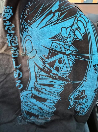 After that, I walked around the artist alley/gallery for the rest of the time. Unfortunately, the artist gallery had a rule where only ONE of the print could be sold per day, so by the time I got there all the prints I wanted were gone. I was really disappointed because there was this really amazing BlackDevilX Final Fantasy Sonic tribute drawing that I wanted to buy... he'd passed away last year, and I'd loved his games so much. The artist alley had more stuff, but in spite of that, nothing was grabbing my attention. I thought I would leave with just the autographs... but then I found a vendor selling a Final Fantasy Sonic shirt!